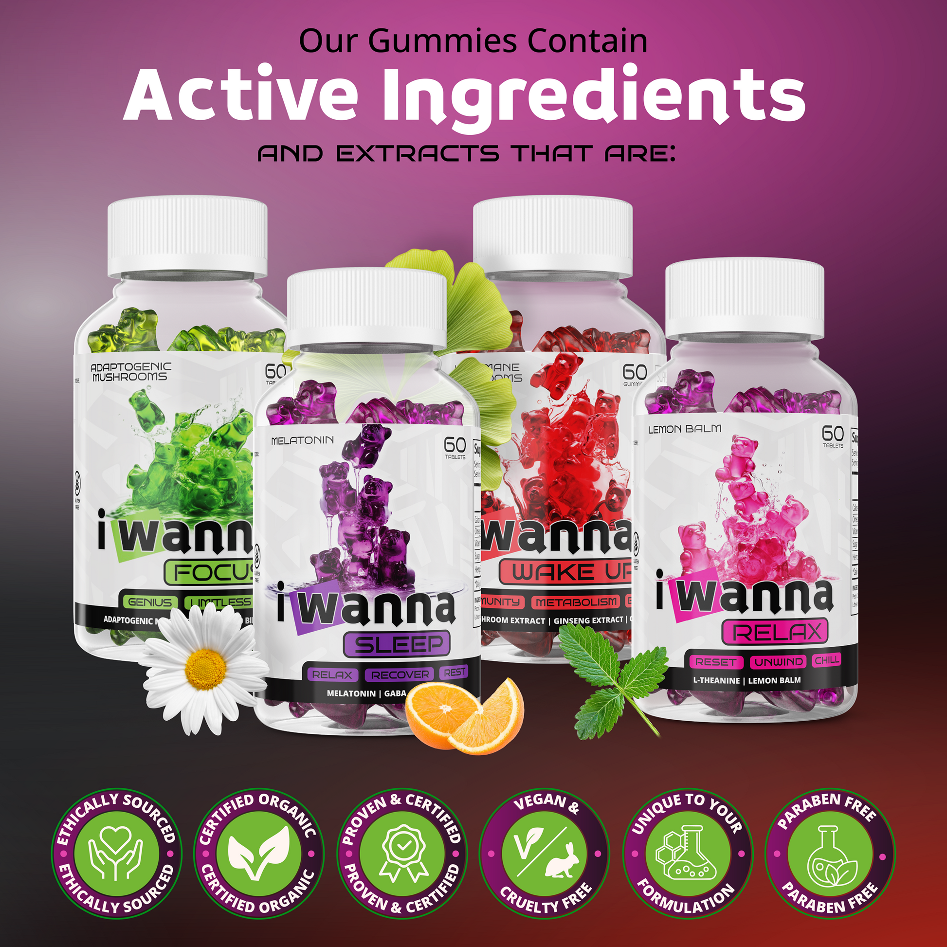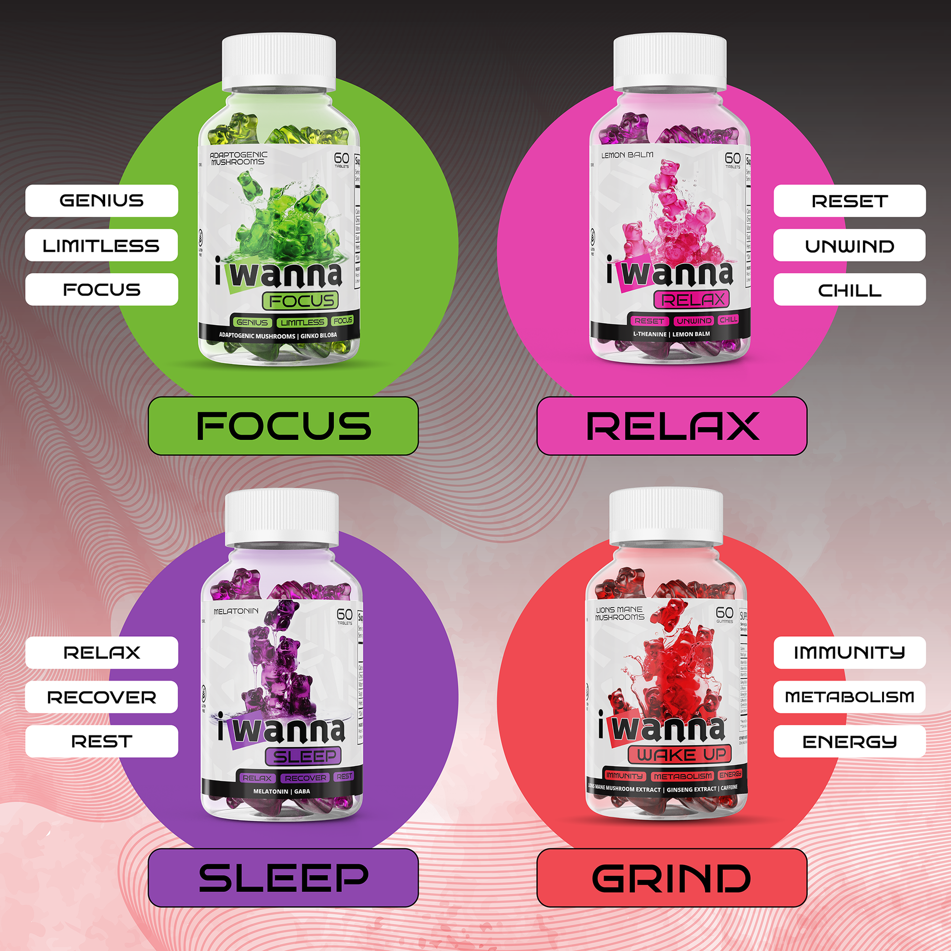 Discover the full I Wanna routine in one sleek box. The "I Wanna" Experience Box gives you a 30-day supply of Sleep, Relax, Focus And Wakeup gummies, so you can match your gummies to your mood, build a morning-to-bedtime ritual, and find the formula that fits your lifestyle and wellbeing best. All with a built-in saving when you bundle them together.*